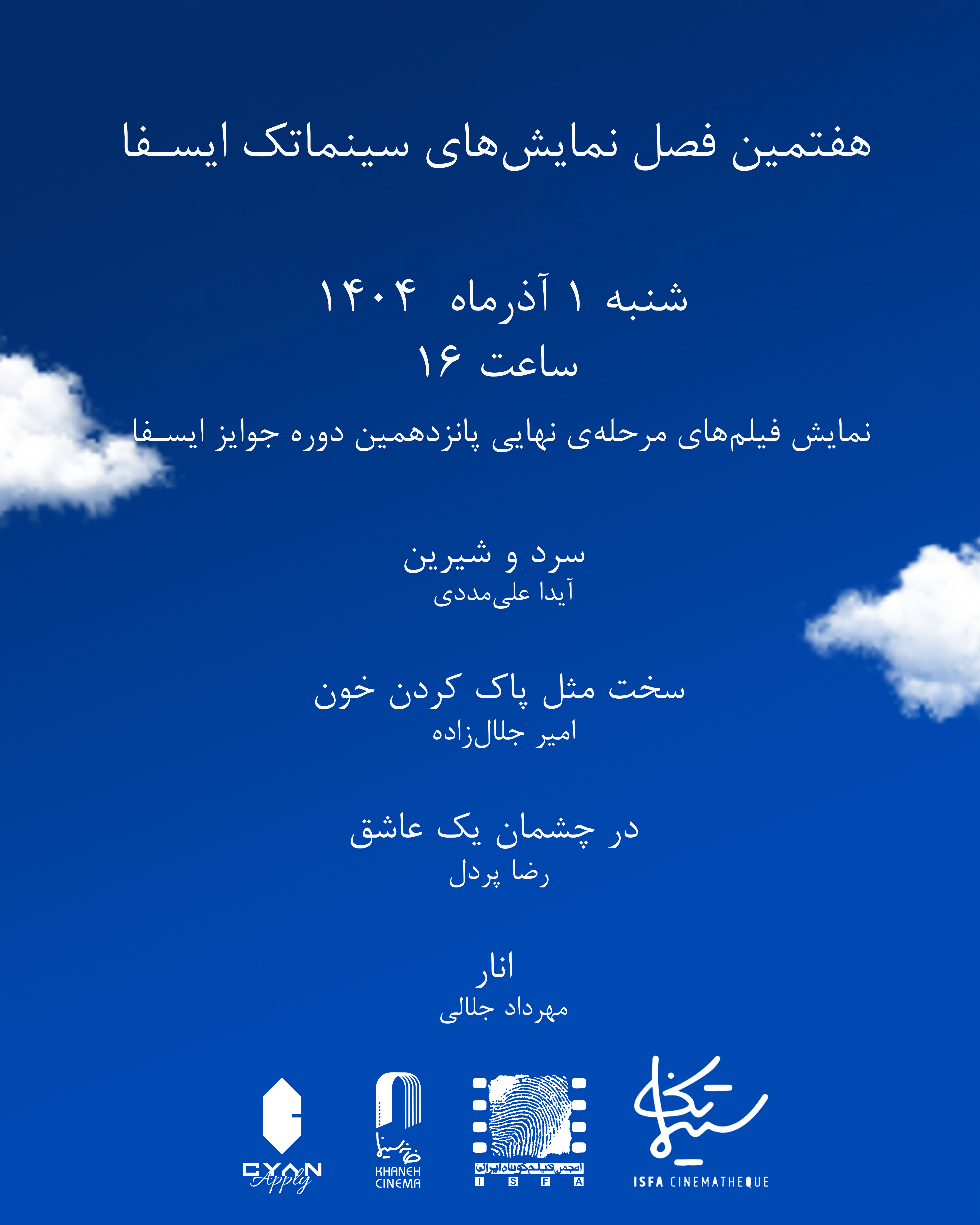 به گزارش روابط عمومی خانه سینما، دومین جلسه از هفتمین فصل از نمایشهای سینماتک ایسفا به نمایش فیلمهای مرحله نهایی پانزدهمین دوره جوایز ایسفا اختصاص پیدا کرده است.